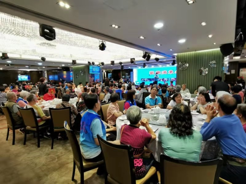 坊會舉辦歡樂滿東華茶聚,義工幫忙搬禮物。