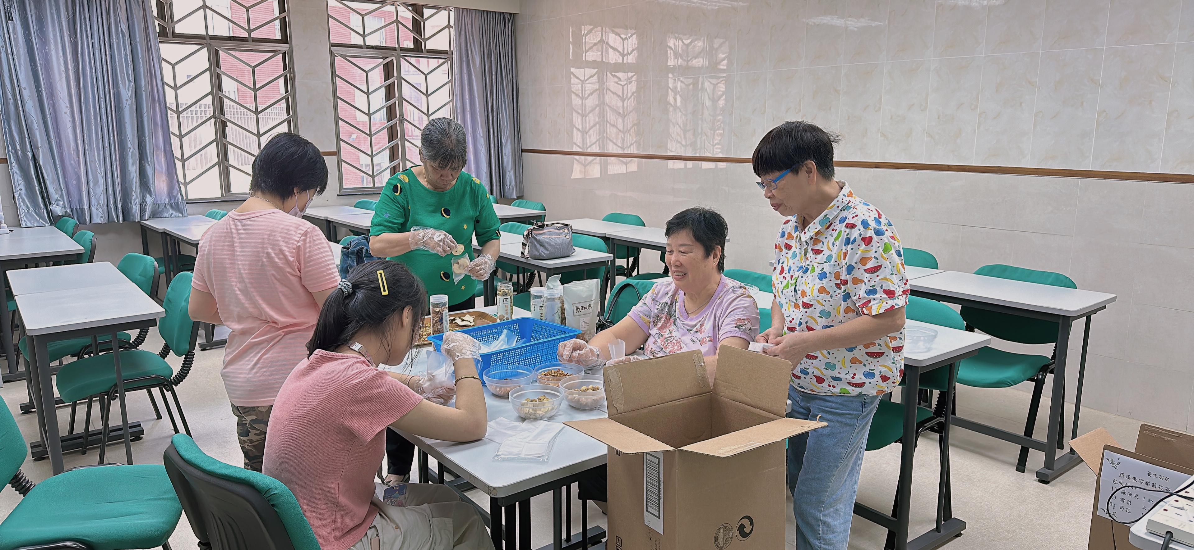 義工們順利完成製作60盒愛心養生茶包,贈予獨居長者們。